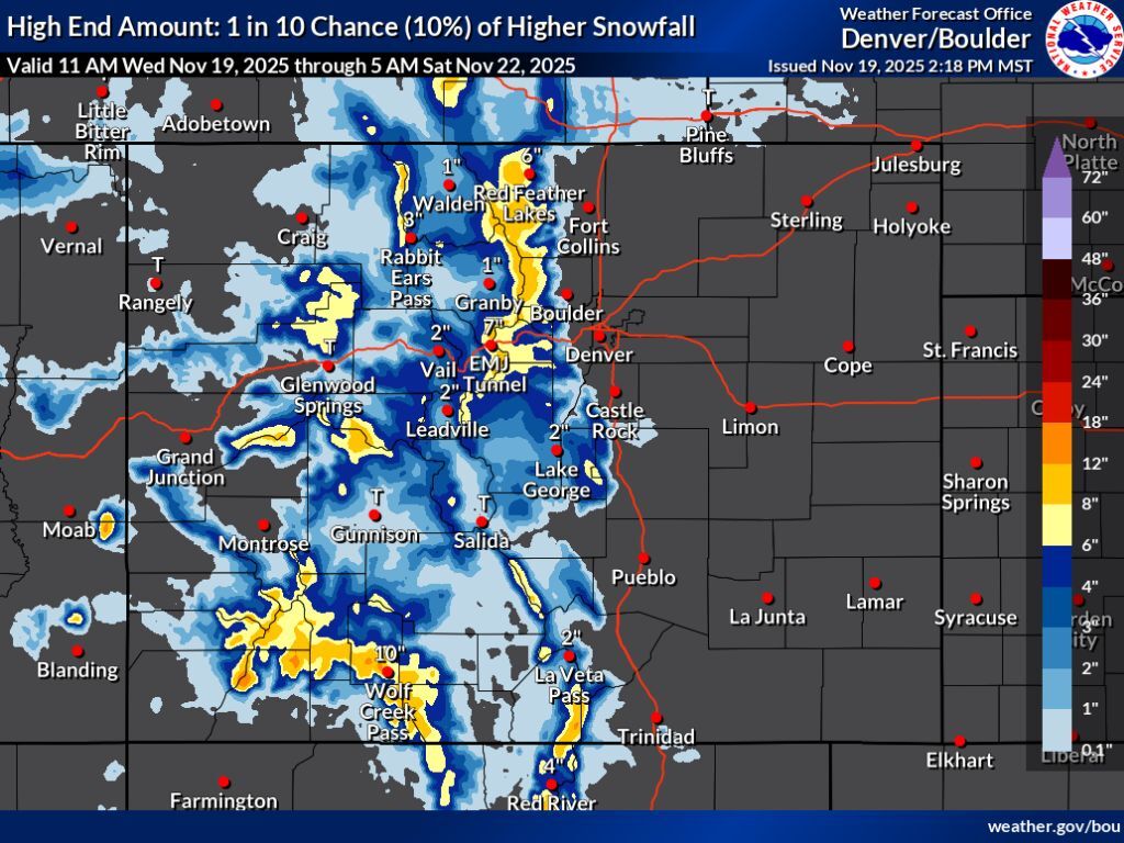 In the most likely scenario (80% chance), the National Weather Service is calling for some parts of southwest Colorado to get about eight to 12 inches of snow through Saturday morning with more than 12 inches possible on a few select peaks. The southern Sangre de Cristos should also get snow in the eight to 12-inch range, as well, with the Continental Divide north of I-70 likely to get about six to eight inches, too. Elsewhere, most mountains should get at least a dusting to about six inches.