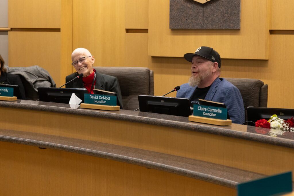 Mayor Nancy McNally and Councilmember David DeMott speak during their last night on the Westminster dais on Dec. 1. (Courtesy of the City of Westminster).