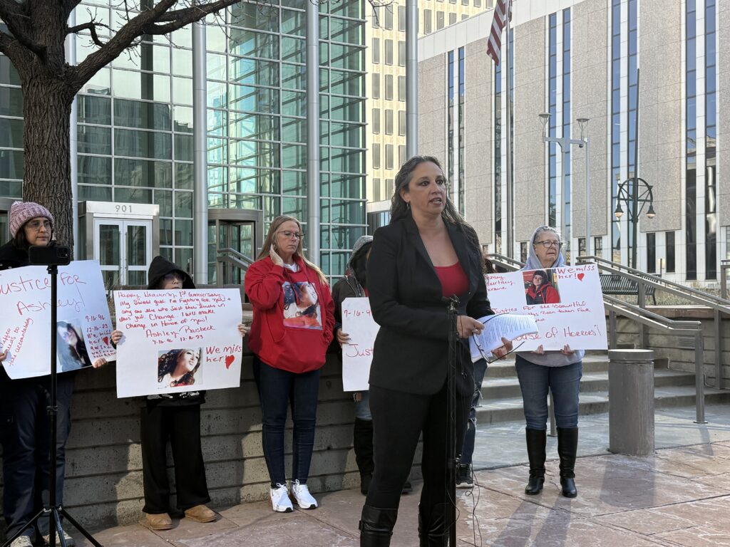 Jaime Raisbeck, Ashley’s mother, stood outside of the Alfred A. Arraj Courthouse Wednesday morning, a line of family holding memoriam signs behind her.