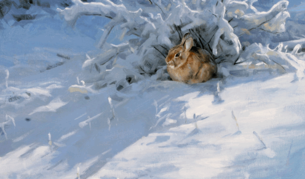 “Painting snow offers lots of challenges,” Aldrich said. “Being white, snow has no inherent color, so the color is entirely dependent on the colors around it that it reflects. The cool blues of the sky, the warm tones of fur or rocks subtly influence the color of snow.”