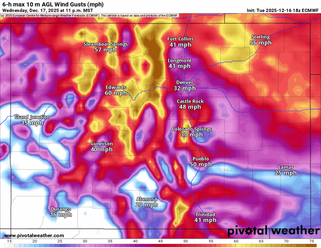 A very windy day is forecast on Wednesday and Wednesday night for the Front Range Mountains from the Wyoming/Colorado state line to Colorado Springs in the north and in the Wet and Sangre de Cristo mountains from Pueblo to the Colorado/New Mexico state line in the south.