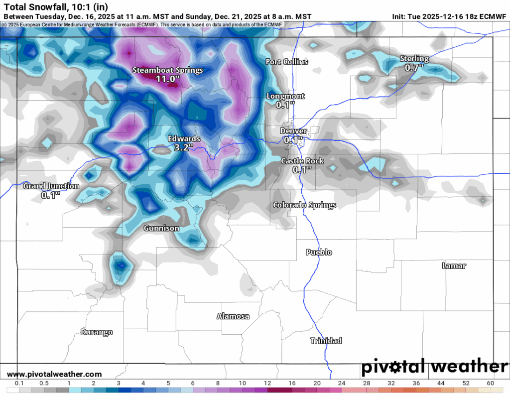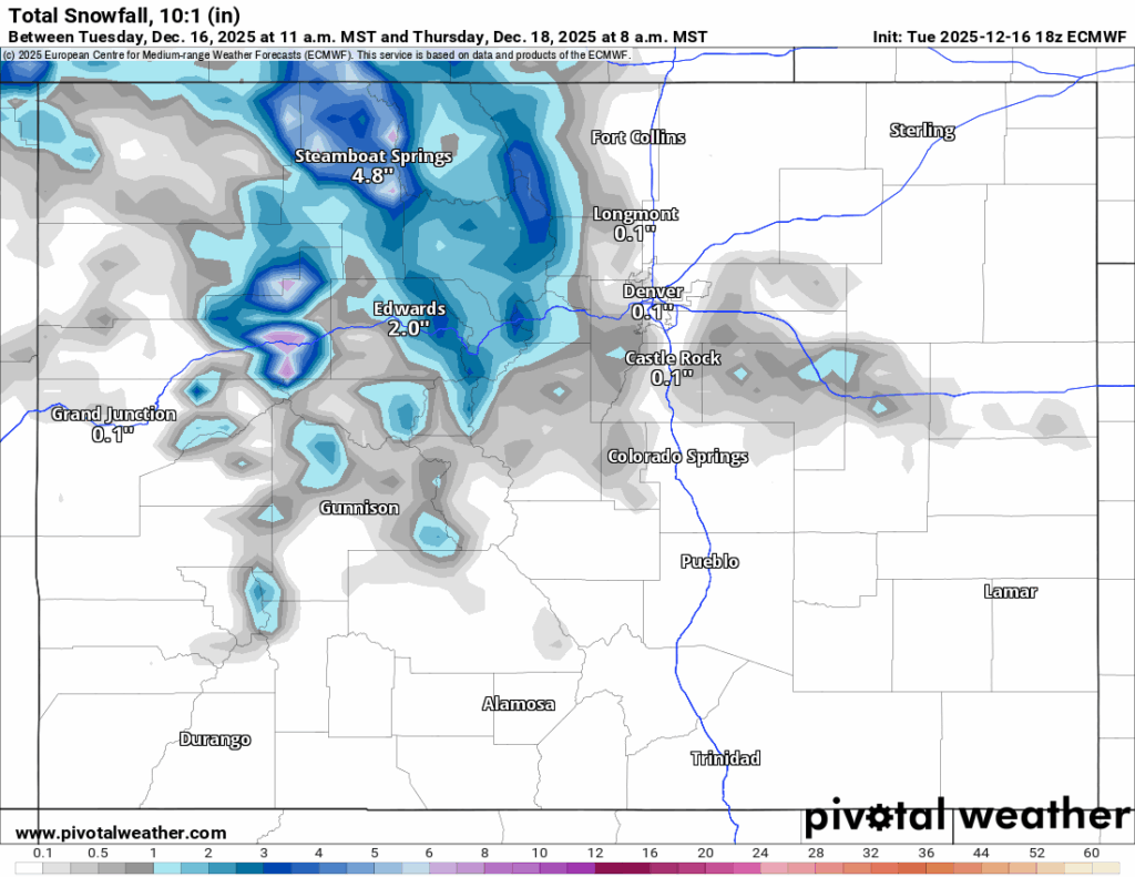 This wave is still focused on northern and central Colorado primarily, with an additional 4-6 inches possible in the northern mountains with the highest amounts once again around Steamboat, in the central mountains between 2-3 inches with the highest amounts in the northern Sawatch Mountains and north and south of Glenwood Springs, and in the southern mountains between 1-2 inches nearly all in the northern San Juan Mountains.