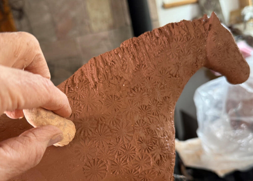 Laugesen’s glazed and fired clay horses stand on bases she fashions from wood or metal. Her sculptures range in size from life-sized horses installed at the Englewood Civic Center and in the Lowry Neighborhood to smaller, table-top works.
