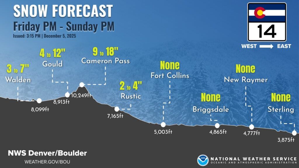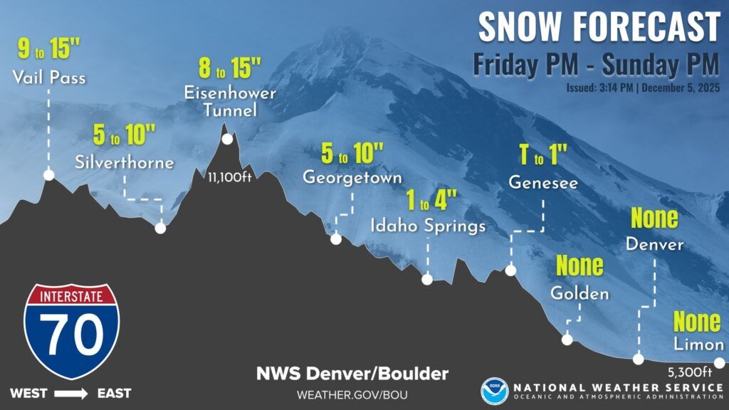 With big snow on the way this weekend and Colorado’s central and northern mountain regions set to get double-digit accumulation through Sunday (and one range having the potential for four-plus feet), the National Weather Service has released a series of its more interesting winter weather-related images. The images depict how much snow is expected on various high-traffic roads around the state, providing some easy-to-digest insight on what travelers can expect.