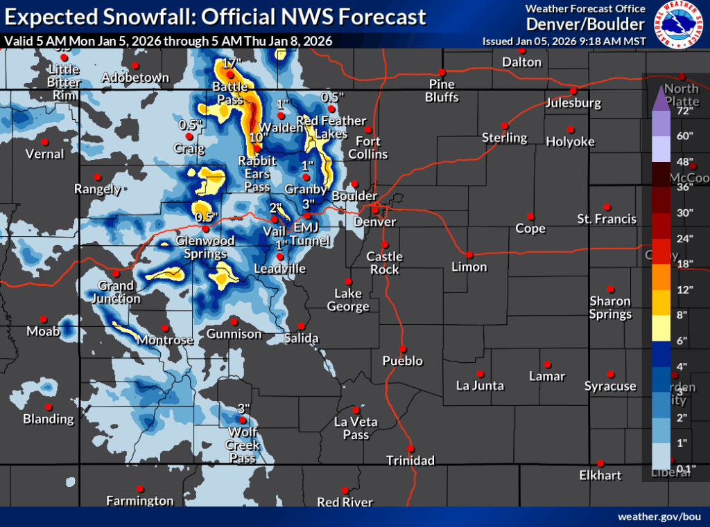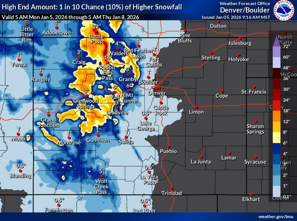 In the ‘high-end’ forecast, deeper totals in the range of eight inches to a foot of snow are much more widespread, with peaks near Aspen and those of the Flat Tops also having the potential for between 12 and 18 inches of snow. The Park Range remains favored, expected to get snow in the range of 18 to 30 inches if this high-end scenario holds true – and remember, this mapping product only accounts for snow through Thursday morning with more snow expected in hours to follow that.