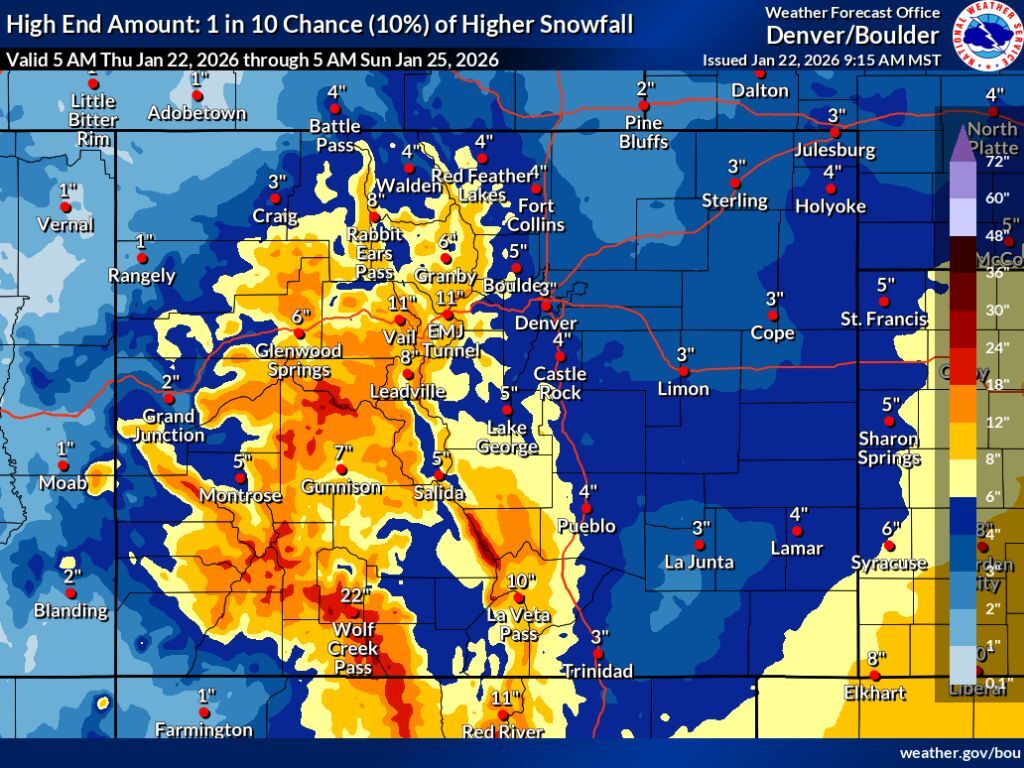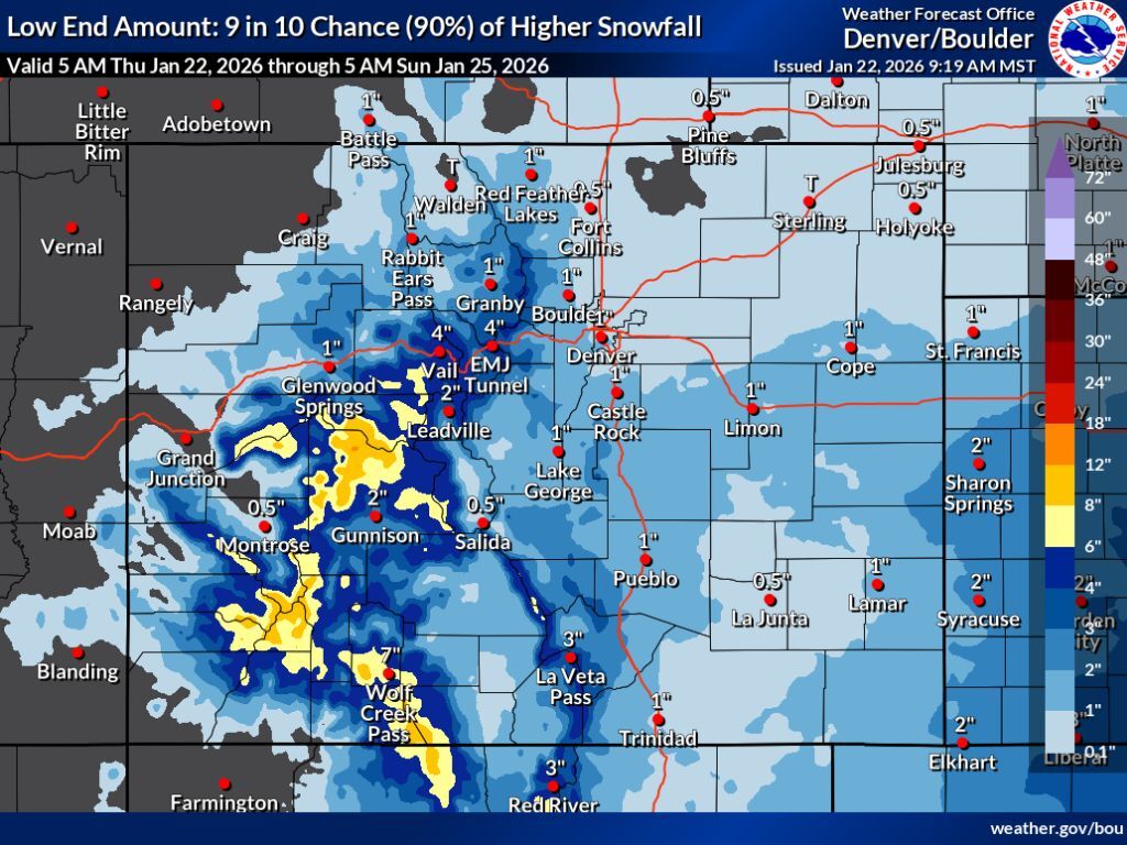 In all scenarios, at least some snow hits Colorado from Thursday into Sunday morning. Totals along the Front Range metro areas should be manageable – about an inch in Denver on the low-end up to four inches on the high-end. I-70 travel into the mountains, however, could see greater impacts, with the high-end scenario showing between 12 to 18 inches being possible on some stretches of this heavily-trafficked route. Couple that with increased traffic of desperate Coloradans long awaiting a powder day and that’s the recipe for delays.