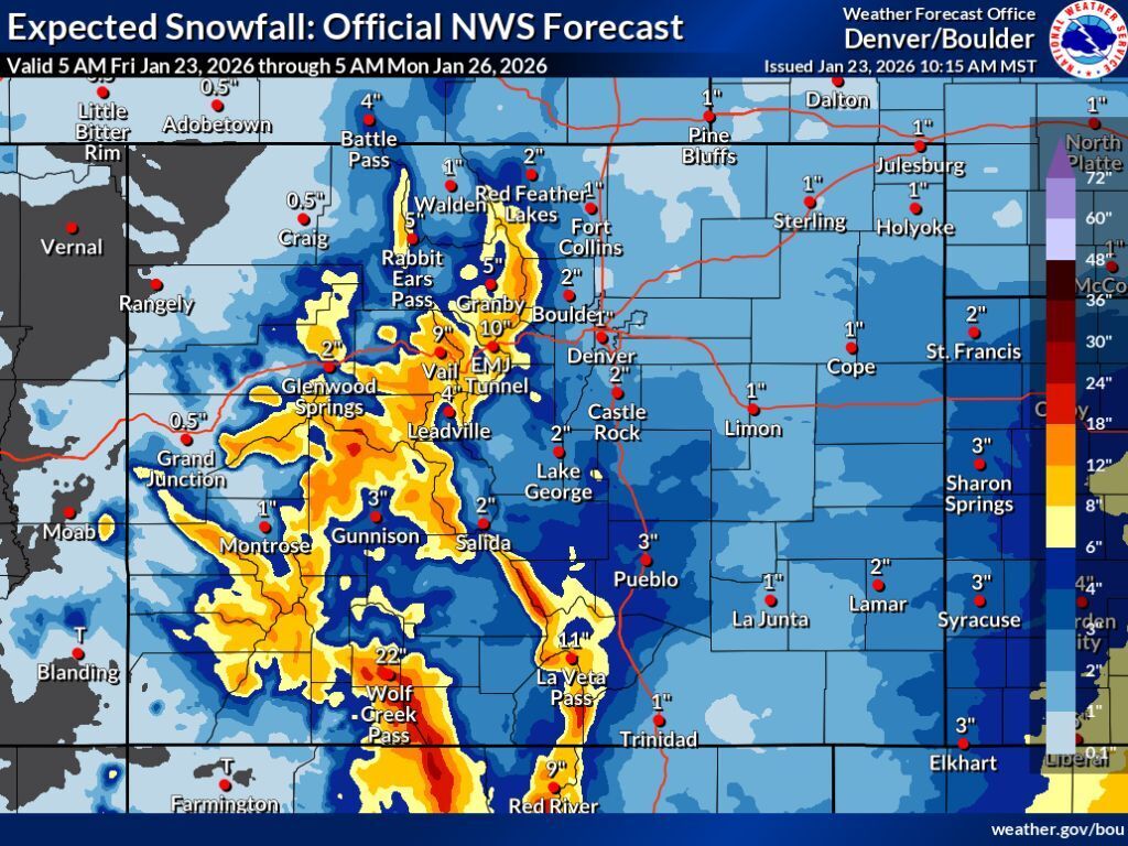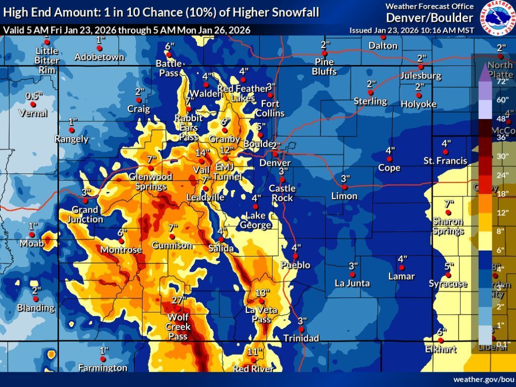 In all scenarios, the Front Range metro area is expected to be mostly missed, with about two inches of snow expected in Denver should the ‘high-end’ snowfall scenario occur. That’s not to say the Front Range won’t be impacted by this winter storm, though. Denver, for example, is expected to hit a temperature of negative five degrees over the weekend, and that’s significantly warmer than what’s expected in some other spots. Breckenridge could hit -16 in the mountains and Limon on the Eastern Plains could hit -21.